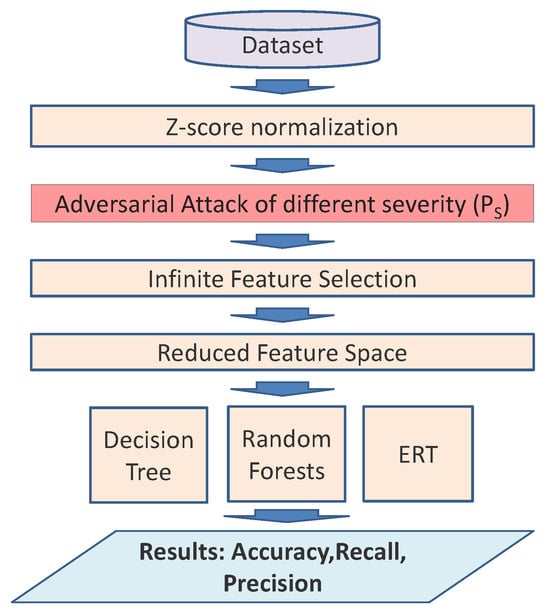 Then, the steps of the methodology pictorially presented in Figure 1 are described in the following bullet paragraphs. The features of the data set were normalized using the Z-score as in [17]. The best features of the data set (out of the 112 features) were extracted from the data set using the IFS algorithm. The identified features were consistent with the optimal features found in [17]. On these data, adversarial threats with different levels of severity (percentage of the number of tampered network flows on the overall number of network flows) were implemented by label flipping and feature-based tampering. Finally, the classifiers were applied: DT, Discriminant Analysis Classifier (DAC), Linear Classifier (LC), RF and ERT, and the performance of the ERT was compared with the DT and RF algorithms.
