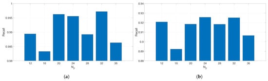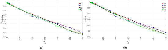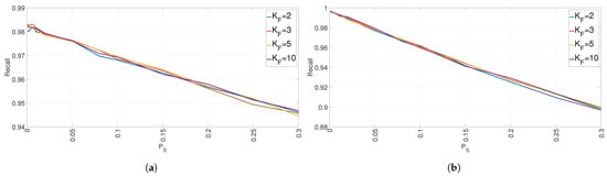 Figure 12a,b show the impact of the parameter for the different values of . It can be seen that the smaller is the data set (i.e., larger values of ), the lower are the values of precision and recall. Then, a larger data set can improve the robustness of the approach.