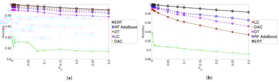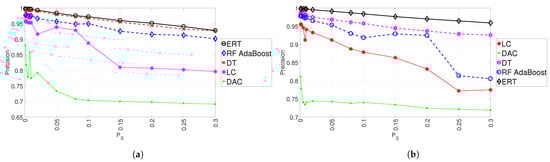 The figures presented in this section show the comparison of the application of ERT for different values of the severity of the adversarial attack against RF, DT, LC and DAC using the accuracy, precision and recall metrics for both attacks: label flipping and feature-based.