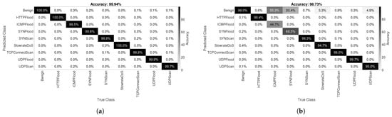 All the confusion matrices show the nine classification classes considered in the study: the benign legitimate traffic and the eight attacks. The shades of gray indicate the degree of accuracy of the classification algorithm.