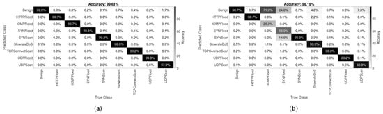 Figure 9 and related Figure 9a,b show that ERT is particularly robust against adversarial attacks because the algorithm is able to identify with good accuracy most of the attacks even in the worst severity (). The degradation of the accuracy for ERT is mostly due to flood attacks (ICMPFlood and SYNFlood). This may be due to the consideration that these attacks are characterized by a multitude of messages of the same kind (e.g., ICMP echo-requests), and the algorithm may confuse benign traffic with malicious traffic. In fact, the confusion matrix shows that most of the errors are due to false positives where the positive class is the benign traffic. In fact, a small (around 4–5%) but significant number of false positives appear also for the SlowRateDos attack, which is another Denial of Service attack.
