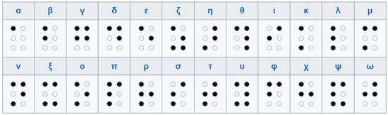The braille alphabet that was used was the Greek Braille alphabet [28], which is depicted in Figure 1.