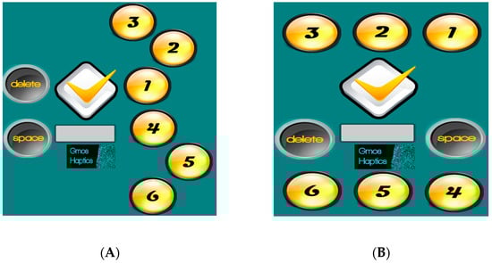 The second layout, as seen in Figure 3B, has the function keys placed at the edges of the screen in two groups of three. In order to be easier to use, the specific arrangement requires users to have the screen of the device facing away from them, while at the same time, they can hold it with their two hands and the three fingers of each hand placed on the two groups of buttons, respectively. In both layouts, every time the user enters a character, a vibration follows, accompanied by voice confirmation of the entered character.