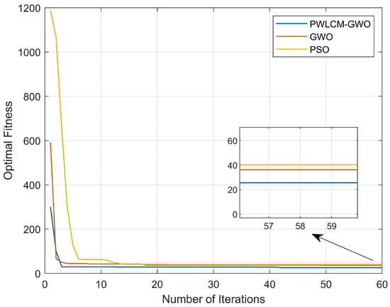 A simulation comparing the fitness of different algorithms under various iterations is shown in Figure 2, where the horizontal and vertical axis represent the number of iterations and fitness, the blue curve in the figure represents the RNTL algorithm, the orange and red curves represent the GWO algorithm, and the yellow curve represents the PSO algorithm. The fitness reduces as the iterations increase and eventually converge to a different value. The proposed RNTL algorithm converged with significantly less adaptation than the GWO and PSO algorithms. Compared to the GWO and PSO algorithms, PWLCM-GWO helps to maintain the population diversity by introducing PWLCM, which avoids the neglect of certain regions. By reasonably adjusting the parameters of chaotic mapping, the PWLCM-GWO algorithm is able to accelerate the convergence speed while ensuring the balance of exploration and exploitation.