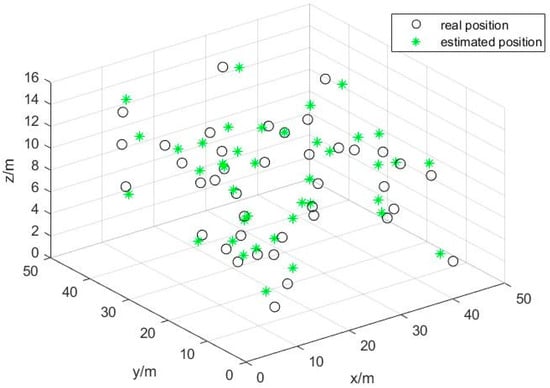 When the SNR is 18 dB and 50 known nodes are distributed inside the space, the 3D localization results of the RNTL localization algorithm are shown in Figure 3, where “” represents the real location of the user to be localized, and the green “” in the figure represents the user’s location estimated by the RNTL algorithm. It can be observed from the figure that there is a higher degree of overlap between the location estimated and the real location of the user to be localized, which shows that the algorithm in this study has a higher localization accuracy.