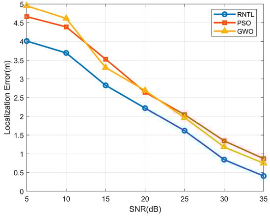 A simulation comparison of different SNRs under the variation rule of the localization error is as in Figure 4, where the horizontal and vertical axis indicate the SNR and localization error, and curves with circles, squares, and triangles in the figure indicate the RNTL, PSO, and GWO algorithms, respectively. It can be observed from the figure that with the increasing SNR, the localization error decreases, which is due to the improvement in the SNR that makes the quality of the communication transmission improve, thus improving the localization accuracy. It is evident that the RNTL algorithm is significantly better than the GWO and PSO algorithm; in addition, we can learn from the figure that when , the RNTL, GWO, and PSO algorithms have a localization error of 0.405725, 0.75053, and 0.872264, respectively, which can be observed as the paper’s proposed RNTL algorithm obtains a localization error of up to 46% lower than the GWO and PSO algorithms. The PSO algorithm can be reduced by up to 46% and 53.5%, respectively, and the proposed RNTL algorithm is effective. The RNTL algorithm proposed in this paper utilizes PWLCM-GWO, an improved convergence factor, and introduces population elimination, which ensures a balanced global and local search and ensures the localization accuracy. In addition, the larger the signal-to-noise ratio is, the stronger the useful signal in the received signal and the smaller the interference is; conversely, the smaller the signal-to-noise ratio is, the smaller the useful signal received.