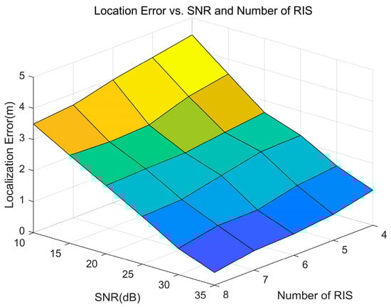 The simulation comparing the localization error for different numbers of RIS at different SNRs is shown in Figure 5, where the x-, y-, and z-axis represent the SNR, number of RISs, and localization error, respectively. From the figure, it can be observed that yellow color represents poor localization accuracy and blue color represents high localization accuracy; as the number of RISs and SNRs increases, the localization error of the RNTL algorithm decreases gradually. This is due to the fact that the larger the SNR is, the stronger the useful received signals are and the smaller the interference is; on the contrary, the smaller the SNR is, the smaller the received useful signals are. An increase in the number of RISs allows the system to solve more estimated coordinates by applying the principle of TDOA, so that the RNTP algorithm of this paper obtains better localization accuracy. At , when the number of RISs is four, the localization error is 1.12836 m, and when the number of RISs is more than four, the localization error is less than 1 m.
