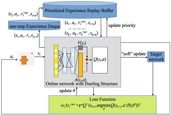 Up to this point, we have presented the proposed PER-n2D3QN method. The comprehensive structure with its processing flow of the proposed algorithm is depicted in Figure 2.