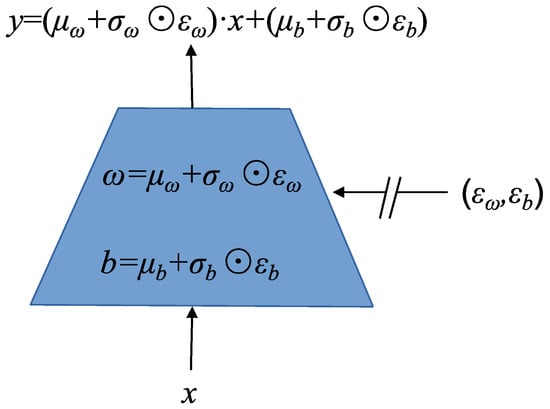 where is the input of the layer, is the output of the layer, and the weight matrix and the bias need to be learned and updated. In the noisy network, is replaced with and b with , where , , , . , , , and need to be learned and updated in the noisy network using gradient descent. and are random noise variables. In the noisy network, the linear layer with p inputs and q outputs is depicted in Figure 3.