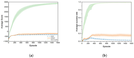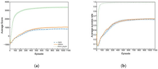 Experimental results in scenario 1 when trained 1100 episodes (shadowed color: Standard Error). (a) Average score over 10 trials. (b) Average success rate over 10 trials.