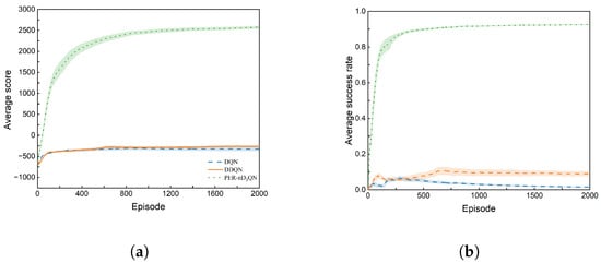Experimental results in scenario 3 when trained for 2000 episodes (shadowed color: Standard Error). (a) Average score over 10 trials. (b) Average success rate over 10 trials.