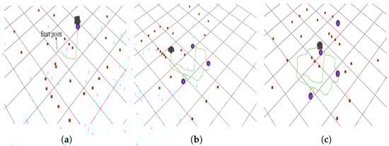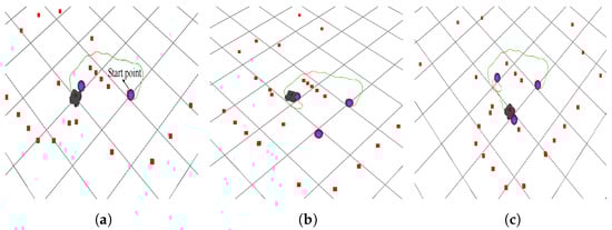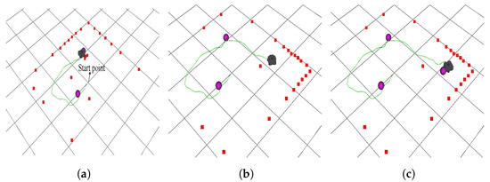The whole path conducted by the PER-n2D3QN algorithm in scenario 2 within one episode. The red square symbol represents the obstacles detected by the radar, the purple sphere represents the target point, and the green curve represents the path taken by the robot within an episode. (a) Case 1. (b) Case 2. (c) Case 3.