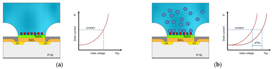Schematic diagram of ISFET drain-to-source current vs. gate voltage to illustrate the operating principle of ISFETs, modified according to [28]. (a) Characteristic curve of the ISFET measurement in the absence of desired ions. (b) Shift of the characteristic curve during the ISFET measurement of the liquid with desired ions in constant concentration.