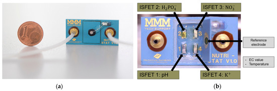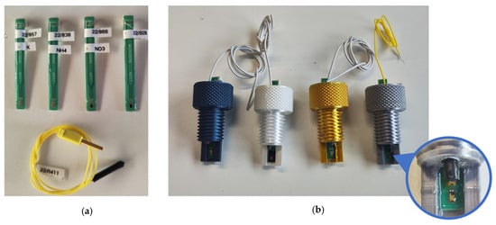 Multi-sensor module NUTRISTAT for soil application. (a) In a closed housing with inlet and outlet tubes for the measuring liquid; (b) the open housing of the multi-sensor ISFET in individual integrated ISFET sensors [38].