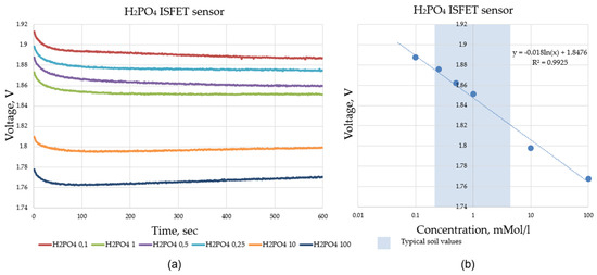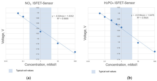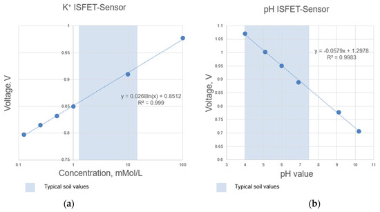 Determined measuring range according to the calibration curves of selected ISFET sensors integrated in the NUTRISTAT multi-sensor module: (a) ISFET sensor, (b) ISFET sensor.