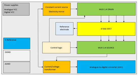 The development of the control and readout electronics for the ISFET multi-sensor module was based on the use of classic analogue signal amplifiers, which have already been described in several literature sources, e.g., [39,40]. The use of already proven circuit concepts and implementation methods allowed for the acceleration of electronics development by drawing on existing know-how and experience. Furthermore, the utilisation of validated methodologies provided a certain degree of assurance with regard to the performance and reliability of the electronics, as these had already been employed successfully in other applications (Figure 7).