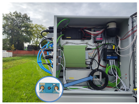 The specifications established during the concept phase for the two ISFET-based measuring systems—soil application and hydroponic application—were duly considered and fully implemented during the realisation phase. When an ISFET measuring system is utilised in a mobile field laboratory in the field, the system is exposed to a multitude of environmental factors, including dust, rain, light, and so forth. In order to protect the ISFET multi-sensor module with the associated control and readout electronics from the environmental influences of splash water, dust, vibrations and light, the aforementioned module was mounted within a dust and splash-water-protected opaque switch cabinet on the mobile carrier platform “Mobile field laboratory soil2data” (Figure 10).