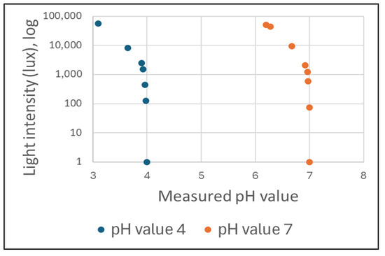 When using ISFET technology, the influence of ambient light on the output signal of the meter must be considered and prevented by appropriate countermeasures. The influence of light on ISFET measurement was verified using a commercially available ISFET-based pH meter. Our own measurement results confirmed the information given by Ito [34] that a significant drift in the output signal of the ISFET sensor can be seen from a light intensity of more than 1000 lux (see Figure 8). The illuminance of 500 to 1000 lux corresponds to the usual lighting in offices and laboratories. It is therefore recommended that an ISFET-based measurement be carried out in a shaded area or in an area darkened against ambient light. These aspects were taken into account in the design of the ISFET-based soil nutrient measurement with the soil2data mobile field laboratory and the ISFET-based nutrient measurement in hydroponic systems. The ISFET multi-sensor module, which was installed in an opaque housing, was also installed in an opaque control box in the soil2data mobile field laboratory. The opaque measurement chamber of the hydroponic system ensured that the ISFET sensor was protected from the effects of light.