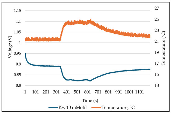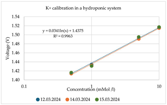 Recently, another agricultural application—ammonium () and potassium analysis in cattle and pig slurry and in digestate—was reported by [11,12]. These measurements were carried out using a measurement system based on ISEs. Son et al. [13] developed a nutrient measuring system for hydroponics using ISEs for ion-specific fertilisation control and set up a study for pepper growing. Furthermore, information on various disturbance variables, such as biofilm formation due to algae growth in the nutrient solution, is provided during the application. Another example of the use of ISEs in environmental analysis for the detection of trace elements, heavy metals and nutrients in water and wastewater is provided by De Marco et al. [14] in a review article. The use of real-time measurement techniques, in this case ISEs, for environmental monitoring is described by De Marco et al. [14] as highly promising and attractive, due to the ability to collect and provide measurement data in a continuous, rapid, relatively low-cost and real-time manner compared to laboratory analysis. It must be acknowledged that any issues that arise with the use of a measurement technology (in this case the ISE measurement unit) when employed in an aqueous solution over an extended period may result from contamination of the electrode, electrode fouling or electrode passivation. It is therefore necessary to implement appropriate solutions such as regular cleaning of the electrodes by rinsing with a suitable solution (for example, a sacrificial calibration standard), conditioning to “activate” the electrode or regular calibration, etc. It is similarly important to optimise the measurement setup regarding any measurement problems that may occur, for example, by carrying out a flow analysis. The objective of these measures is to prevent or reduce electrode drift and instability to maintain measurement reproducibility, measurement dynamics and measurement stability [14].