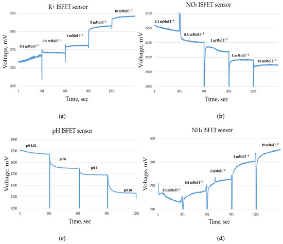 The ISFET sensors in the multi-sensor module were selected following an extensive experimental analysis of the measuring range in accordance with the intended agricultural application, namely, soil nutrient analysis directly in the field and the typical nutrient concentration in the soil (Figure 4 and Figure 5). The ISFET multi-sensor module was connected to the control and readout electronics via a socket connector, which served to provide a secure connection. To prevent corrosion when the module was in contact with a liquid solution, the connecting wires within the multi-sensor module, which were those between the drain, source and gate contacts of the respective sensor and the socket connector contacts, were encapsulated within a water-insoluble compound. The common reference electrode was integrated within the cover of the multi-sensor module, thereby ensuring reliable contact with the measuring solution. The design of the specified ISFET multi-sensor module was developed with the specific purpose of facilitating the integration of the multi-sensor module into the broader system for the analysis of soil nutrients in real time in the field.