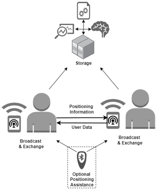 According to the provided definition, a Transactional Area Network should promote simplified, decentralized indoor positioning operations, enabling end-users to benefit from its capabilities. Each exchange of positioning information or other data between two users is considered a ‘transaction’. Thus, every time a user successfully sends and receives information within the network, a transaction occurs. Each instance of new information exchange counts as a new transaction. The minimization of additional hardware is important, since it will encourage broader adoption of the concept. While TAN can include additional devices (such as Bluetooth beacons—see Figure 1 and Figure 2), the network should primarily consist of users with their personal devices. As the adoption of TAN raises, the data generation will inevitably increase as well. Therefore, TAN must also transmit this data to an external database, located outside the network.