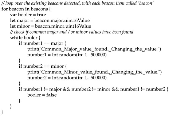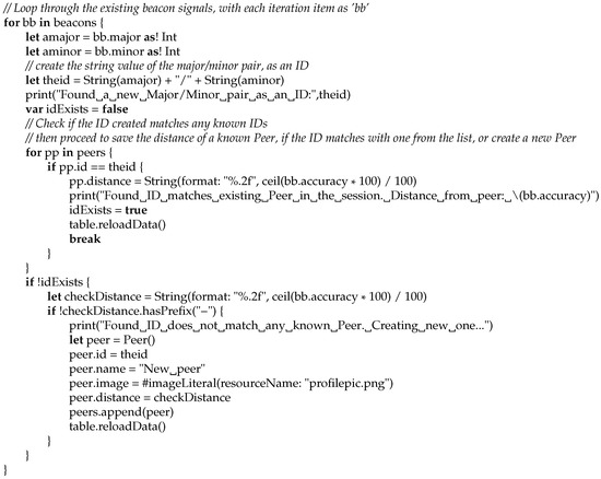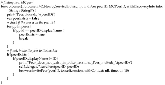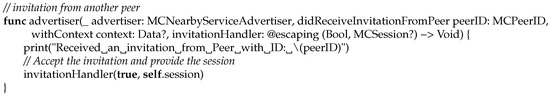 The next step is for the device to initiate a peer-to-peer communication session using the Multipeer Connectivity (MC) framework. Once the device successfully starts functioning as a virtual beacon, the software proceeds to group three essential elements needed for establishing an MC session: (i) the device’s Major/Minor value pair as a beacon, (ii) the user’s name credentials and (iii) an image selected by the user. Furthermore, to enable the MC session, additional characteristics are required. One crucial characteristic is a unique identifier for each device, named ‘myPeerId’. This unique MC peerID differentiates each device, preventing data transfer malfunctions and/or loss. On top of that, two more properties are created: one for advertising each device on the network and another for discovering nearby devices. These are named ‘serviceAdvertiser’ (see Figure 6) and ‘serviceBrowser’ (see Figure 7), respectively.