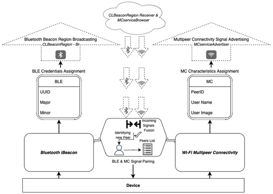 As a result, the device will broadcast as a beacon with Major/Minor values of ‘172/8376’, while also operating as a peer in the peer-to-peer communication environment with the ID ‘172/8376’. When the software detects a BLE signal from a virtual beacon device and simultaneously receives data from an MC peer, it combines the Major/Minor values of the beacon signal into a string variable, separated by a slash punctuation mark (‘/’). Thus, the BLE Major/Minor values ‘172’ and ‘8376’ will again form ‘172/8376’ on the receiving end. The software then compares this new string variable from the BLE signal with the received ID of the MC peer. If they match, it confirms that both signals originate from the same device. If not, the software continues to compare the signals until all are correctly paired.
