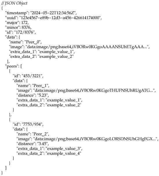 In the context of data transmission, it is crucial to ensure that the data collected by each device is properly structured before being sent to an external database. The resulting dataset, based on the peers list, is carefully organized into JSON objects, contributing to seamless storage and subsequent analysis. Each JSON object is crafted to include essential details such as a timestamp, the BLE UUID, major and minor values of each device, and the device’s ‘peerID’, formed by combining its major and minor values. Since all available information about each peer is contained within the peers list of the device, this list is transformed into a JSON array, where each object represents an individual peer. Consequently, each object consists of the peer’s ID (a combination of its BLE major/minor values), name, base64-encoded image and the calculated distance using the BLE signal (Figure 10). Given the frequency of distance measurements occurring every second, it is important to establish an optimal transmission interval to the database. This interval must balance the necessity for real-time updates with the efficiency of data handling. Therefore, an appropriate transmission interval typically ranges from every few seconds to every minute, depending on the scale of each TAN.