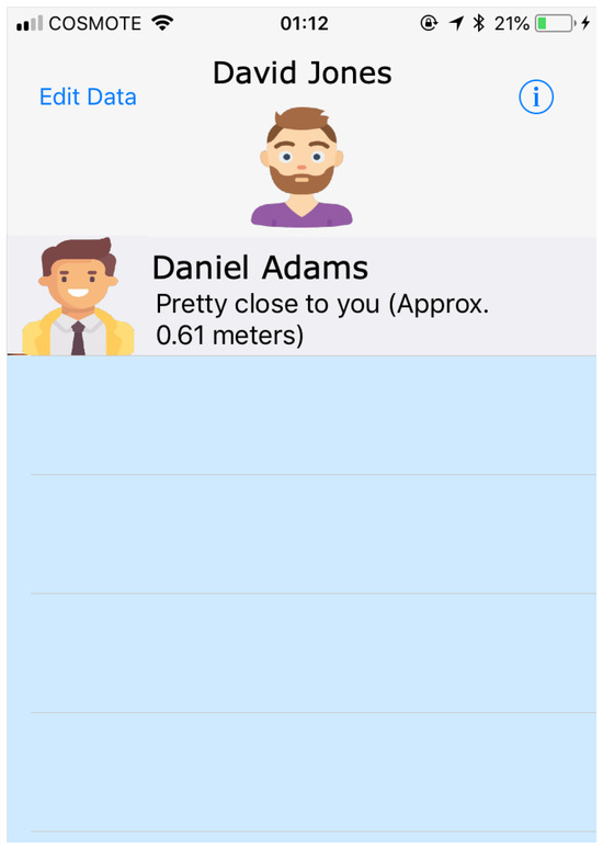 In Figure 11, the moment when two users enter TAN for the first time is depicted. The distance between user ‘Daniel Adams’ (whose device’s screen is captured in Figure 11) and user ‘David Jones’ is less than one meter, indicating close proximity. The BLE signal calculation in this instance is quite accurate. Measurements taken with a physical measuring instrument indicated a distance of approximately 95 cm between the two devices, resulting in a deviation of about five centimeters. Subsequently, David Jones moved closer to Daniel Adams. The application running on David Jones’s device recorded this change, as shown in Figure 12.