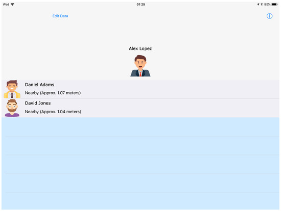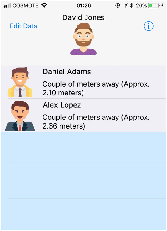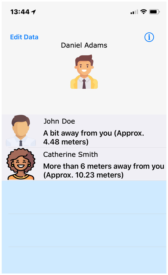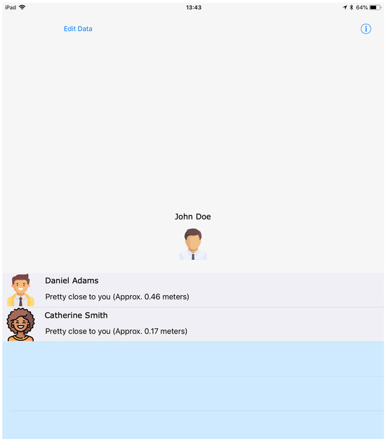 The distance between John Doe and Daniel Adams appears to be 0.46 cm, while John’s distance from Catherine Smith measures at 0.17 cm. Upon actual measurements, one observes a similar deviation as before. John is actually 0.51 cm away from Daniel (a deviation of about 5 cm) and 0.19 cm away from Catherine (a deviation of two centimeters). As previously mentioned, BLE signal distance calculation proves relatively accurate at short distances. However, its accuracy diminishes with increasing distance, affecting the software’s calculations accordingly. Nonetheless, the Multipeer Connectivity session operates smoothly, with each device taking approximately 6 to 7 s (at worst) to receive both names and images of the other peers/users. It is worth noting that both testing scenarios have been repeated three times, yielding consistent results each time, with a deviation of ±3 cm for smaller distances and ±10 to ±20 cm for greater ones.