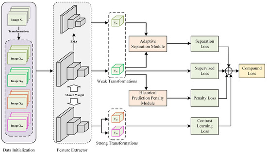 where m is a constant, p is initialized as the probability from the first prediction after the warm-up phase ends, and q represents the current prediction result. We combined the prediction with the model’s current prediction for the sample using the cross-entropy function, resulting in the following loss function: