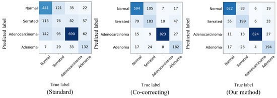 From the confusion matrix of the standard method, we can see that without adding any robustness, the DNNs had rather limited performance in classifying noisy-labeled pathology images. After incorporating the noise-resistant dual-network prediction, the confusion matrix of Co-Correcting significantly improved the classification performance for each class. The confusion matrix of our method demonstrates the classification effect of our method. We further optimized the performance. Compared with previous methods, our method significantly improved the classification ability for the normal class, reducing the confusion probability between the normal, serrated, and adenocarcinoma classes and thereby achieving an overall performance improvement.