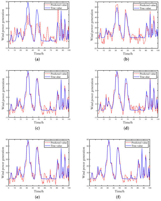 After training, the four models were utilized to predict the wind power generation for the next 100 h. These predicted curves are depicted in Figure 3, where the red dashed lines represent the model predictions, while the blue solid lines represent the actual wind power generation. From the fluctuation trends observed in the six subplots of Figure 3, it is evident that the predictions generated by the PSO-LSTM model closely resemble the actual wind power generation, indicating that LSTM is better at capturing the temporal characteristics of meteorological data, thus enabling more accurate predictions of future wind power generation. Furthermore, regarding the fluctuation amplitudes observed in the six subplots of Figure 3, the models based on the mRMR algorithm exhibit smaller fluctuations around the actual wind power generation. This suggests that the mRMR algorithm effectively filters out redundant meteorological features, enhancing the robustness of the model’s predictive performance. It is noteworthy that the proposed mRMR-PSO-LSTM model achieves the most accurate predictive performance among the six models, considering the comprehensive consideration of the temporal and redundancy aspects of meteorological features. This indicates that the model effectively addresses the issues of redundancy and temporality in meteorological features, significantly improving the accuracy of wind power generation prediction.