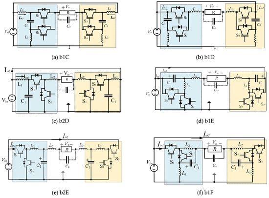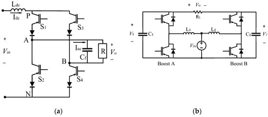Buck–boost inverters play a crucial role in connecting RESs to the utility grid and ac loads when the input voltage fluctuates below and above the output voltage. The DM buck–boost inverters have been presented in several publications [,,,,,]. There are eleven SSSD buck–boost converter topologies; seven of them are voltage-sourced boost-type converters, while the rest are current sourced.