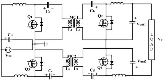 Electrical power conversion usually depends on power electronic converters in shaping the electricity from one form to another using semiconductor devices (e.g., switches and diodes), passive elements, and storage devices []. The power electronic converters are mainly classified, based on their power range, into low-power, medium-power, and high-power converters []. The low-power converters are important in many applications, such as renewable energy systems (RESs), including photovoltaic (PV) systems, fuel cells, battery energy storage (BES) systems, chargers, and power supplies []. Medium-power converters are used in motor/drive applications, as well as in renewable energy systems such as large PV systems and small wind turbines. High-power converters are needed in many applications, including large motor/drive systems and wind turbine systems [].