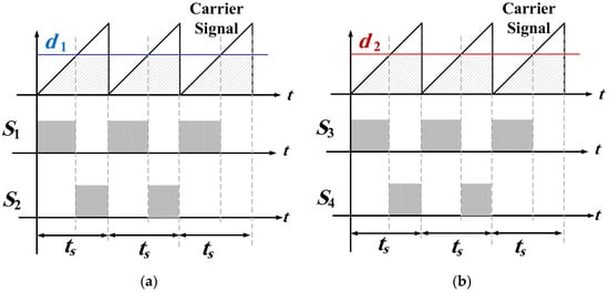 The relation between the duty–cycle ratios and the devices’ gate signals are shown in Figure 5. The carrier signals are generated by the micro-controller at a switching frequency of fs = 1/ts. The same comparison method applies for all DMSIs types. For voltage-sourced topologies, it is required to have a dead-band period between S1 and S2 and S3 and S4 to avoid short circuits across the input supply and output load if the devices turn on/off slowly. For current-sourced topologies, it is required to secure an overlap period to avoid open-circuiting the inductors, which can generate high-voltage spikes that can destroy the semiconductor devices.