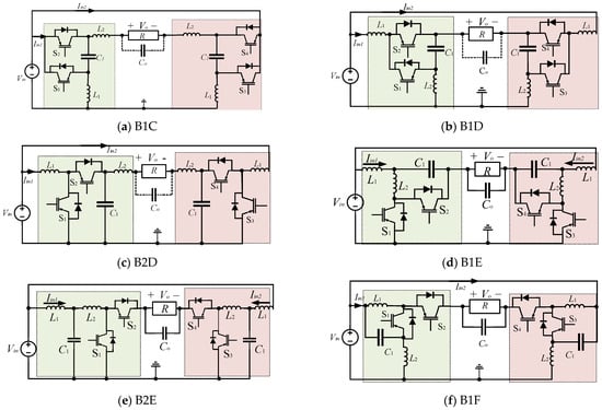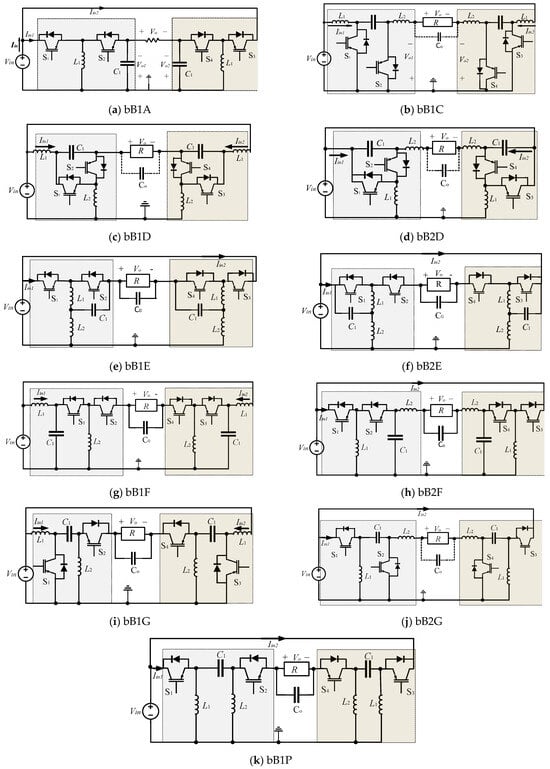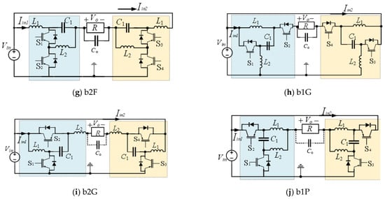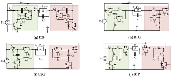 Boost inverters are needed in several renewable energy applications when the output voltage is required to be higher than the input one. There are eleven SSSD boost converter topologies; seven of them are voltage-sourced boost-type converters, while the rest are current sourced. The descendant dc/ac inverters are shown in Figure 17. The majority of the boost inverters have at least one right-hand-plane zero (RHPZ), which complicates the control design.