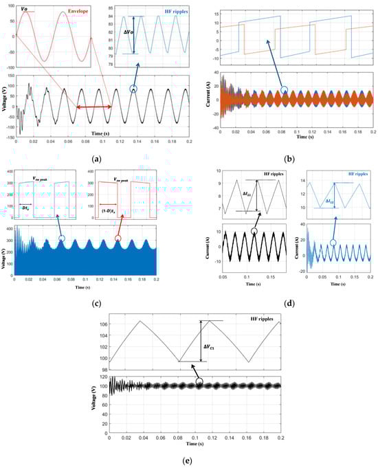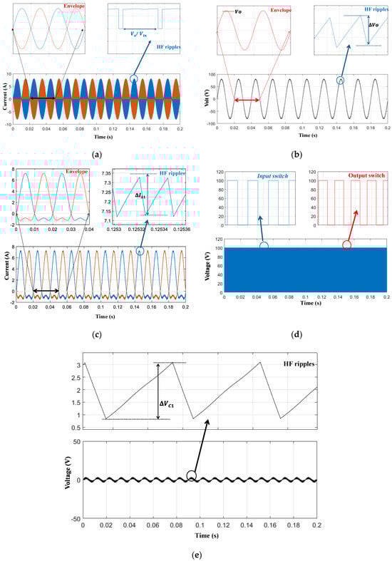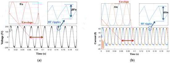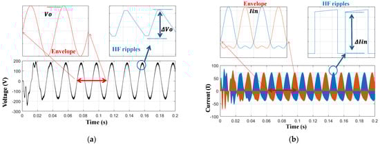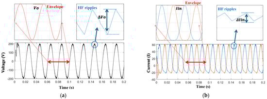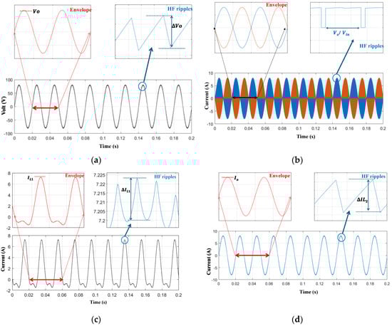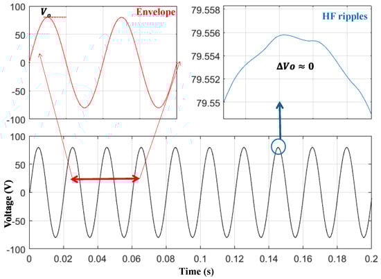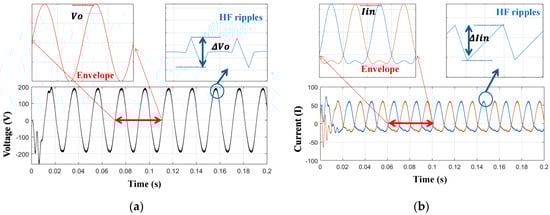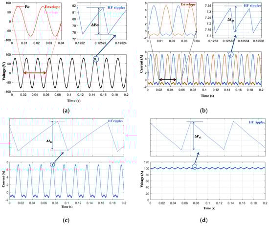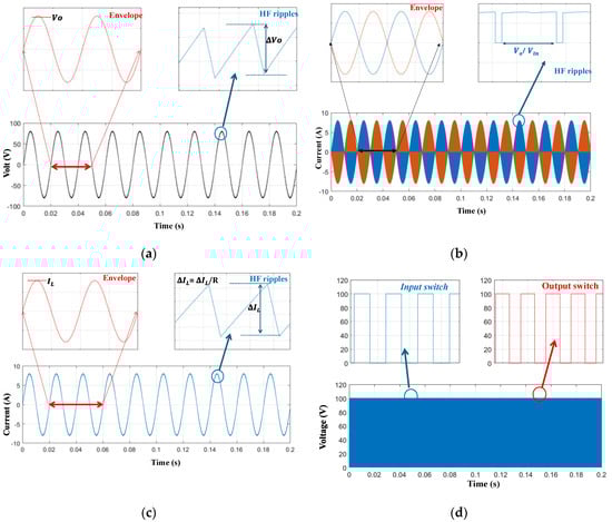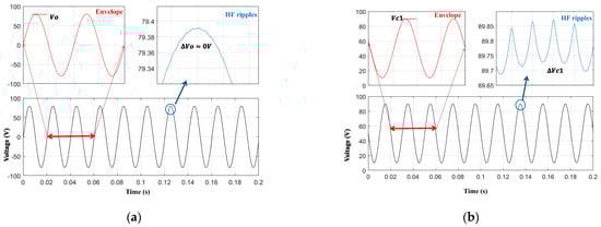 Figure 7 shows the operation of the b1A DMSI when the input DC voltage is Vin = 100 V, and the output is controlled to generate vo = Vo sin(ωt), where Vo = 80 V and ω = 314.16 r/s. Figure 7a shows the output voltage waveforms, which are important in designing the output inductor. As the b1A inverter has a continuous output current, the output capacitor Co can be eliminated or be of a small capacitance value, which is to the inverter’s advantage. The peak of the HF voltage ripple is expressed as