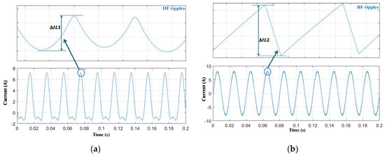The b1D DMSI has a similar performance to the b1C except for the inductors’ currents. Figure 9a shows the current through the first inductor iL1, where the peak value of the current is calculated from (6). The HF current ripple of iL1 is very small compared with other types; therefore, a small inductance L1 can be used as in (10):
