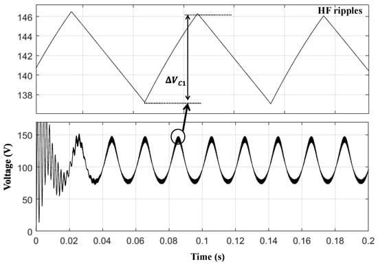 Similar to the b1A inverter’s input current in Figure 7b, the b1E inverter has a discontinuous input current, making it a less-attractive candidate renewable energy source (RESs), requiring a continuous input current, such as via PV applications. The output voltage of the b1E inverter has a very small HF ripple, as shown in Figure 11a. Unlike the previous inverters, the capacitor C1 voltage VC1 has a dc and a second-order sinusoidal component, as shown in Figure 11b. The HF ripple voltage of VC1 is very small, and a small capacitor may be used.