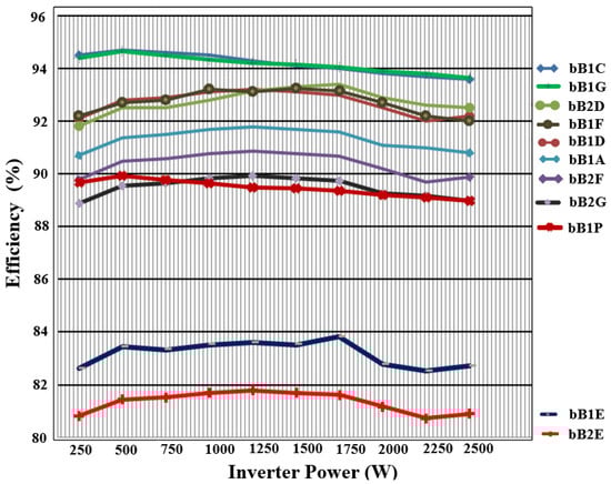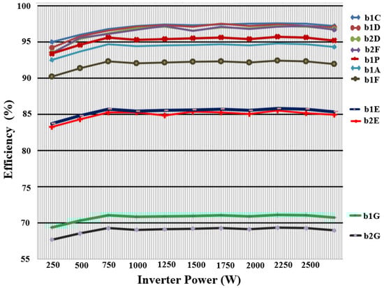 The efficiency comparison is shown in Figure 23, where the b1C DMSI has the best efficiency. The different voltage conversion ratios of the inverters from cell G (b1G and b2G) caused them to have the highest power losses and hence the lowest efficiency.