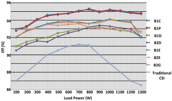 Similarly, the different boost DMSIs were tested using the same parameters in Table 8 but at lower power (from 100 W to 1300 W). Figure 24 shows the efficiencies of the different inverters with identical passive components. B1C and B1P have better overall efficiency than the conventional CSI. B2G has the worst efficiency because of the higher inductor and switch currents. For Cell D inverters, B1D has better efficiency than B2D for D < 0.5, while B2D has better efficiency for D > 0.5. B1E and B2E have comparable efficiency.