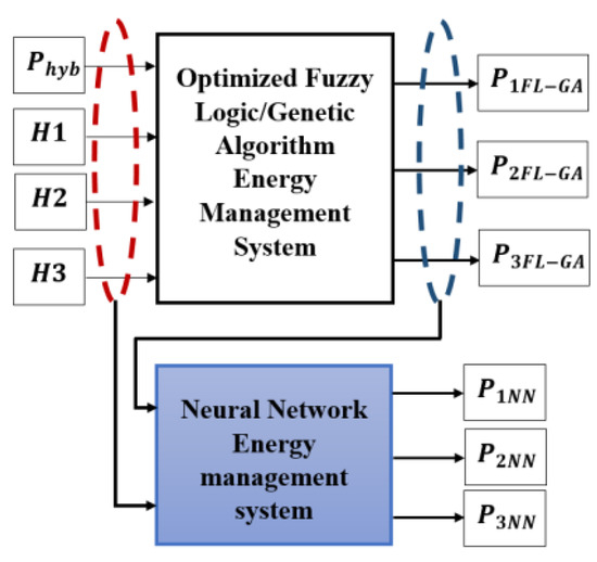 To highlight a real-time energy management strategy, the authors propose to exploit artificial neural networks (ANNs) as an effective solution. The artificial neural network is a widely used technique for managing power flows between energy components. Inspired by the functionality of biological neurons, an ANN consists of at least two layers of neurons: an input layer and output layer, typically including more and more hidden layers (multi-layer). Each layer comprises numerous specialized neurons. In this study, the ANN model features four neurons in the input layer, representing the hybrid power and the three tank’s levels, and three neurons in the output layer, corresponding to the three motor pumps’ power. There are two families of learning mechanisms for the neural network: supervised learning and unsupervised learning. In a supervised learning model, the data are structured into two sets: the input data, which are the input variables of the model, and the output data, which are the correct results that the model must pursue. In an unsupervised model, only input data are used for modeling, without explicitly providing associated “correct” output data. The majority of highly successful neural networks today employ supervised training, where both input and output data are provided for training. Among these, the multilayer perceptron (MLP) backpropagation algorithm with supervised training is widely preferred due to its accuracy and its suitability for implementation on large datasets [20]. It achieves a higher accuracy rate and reduces prediction errors through the use of backpropagation. It can also easily work with non-linear problems which is performed with the studied system. For this reason, the obtained results by an optimized fuzzy logic energy management system are used for the training [15] (Figure 3).