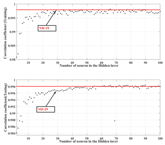 Figure 4 displays the results of the PSA, showing the correlation coefficient R as a function of the number of neurons in the hidden layer during both the training and testing phases. Based on these results, the most effective architecture for this ANN energy management system involves 29 neurons in the hidden layer (NH = 29). The neural network model successfully estimated power distribution throughout the year, achieving high values for the correlation coefficient R (99%), a root mean square error (RMSE) of 167.2 W, and a coefficient of determination of 99%.