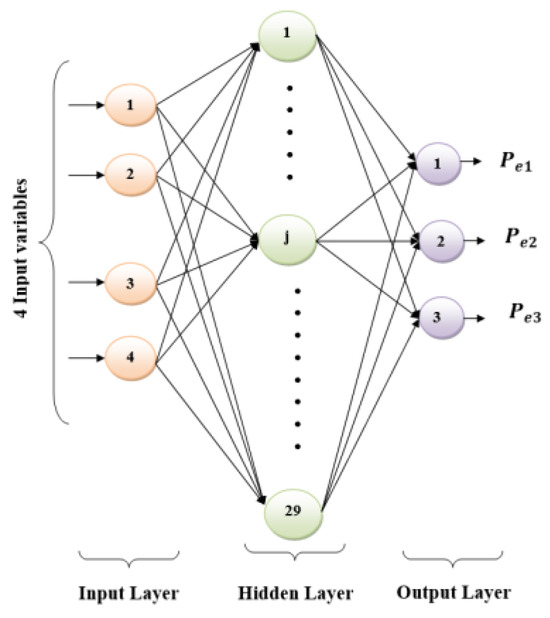 The training and testing results for the three evaluation metrics mentioned earlier are presented in Table 1. According to the data in the table, the ANN achieves its optimal performance using the Levenberg–Marquardt-based training function Bayesian regularization (trainbr).