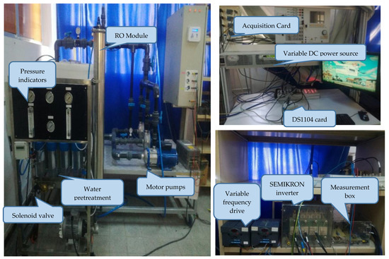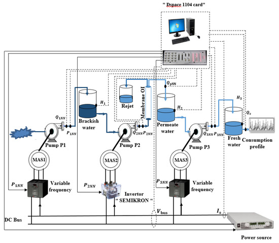 According to the United Nations (UN) in 2020, the global rate of the water use has increased by 1% per year since the 1980s, and it is projected that by 2050 it could exceed 30% of current levels. Indeed, water availability directly affects food security and the production capacity of each country [1]. Although access to drinking water and basic sanitation is a human right and essential for food security, health, and hygiene, there are still very alarming facts in the world. A staggering 844 million individuals lack access to safe drinking water, 2.4 billion people lack access to basic sanitation, 2 billion people live in regions experiencing high water stress, and 4 billion people suffer from stark water scarcity for at least one month in a year [2]. Water management is therefore a crucial issue that merits special attention. For this reason, it is necessary to have new technologies to provide fresh water such as desalination, which requires energy for its operation [3]. Water desalination systems are energy-intensive. In addition to the water problem, according to the International Energy Agency (IEA), 600 million of the 674 million people in sub-Saharan Africa will become without access to electricity by 2030, most in rural areas [4]. Hence, the use of renewable energy sources, especially photovoltaic and wind, is an attractive solution to address the problems of energy and water simultaneously [5,6,7]. However, the different energy management strategies have common objectives: avoiding deep discharge of energy storage units, decreasing peak load demand, and reducing the storage/destocking energy phase. They also aim to maintain the stability of the continuous bus, reduce the cost of operation and maintenance, and increase the efficiency of the system [8]. Many studies have contributed to defining the methodology for managing energy between different energy sources. In the literature, energy management strategies are generally classified into two categories: “rules-based” strategies and “optimization-based” strategies whose implementation differs depending on the application. In the field of stationary applications (smart home), an energy management system (EMS) coupled with an autonomous hybrid renewable energy source (PV–wind–hydrogen-battery) [9] was used to meet the power requirement of a stand-alone house located in Alora (Malaga) in Spain. The simulation results show that the proposed control meets the objectives established for the EMS and achieves a total saving of 13% compared to other simple systems based on control states. In [10], the authors used different recurrent neural network (RNN) structures to predict future weather and freshwater demand scenarios to accomplish the power supply of a hybrid renewable energy system coupled to a reverse osmosis (RO) desalination unit. Stefano Leonori et al. [11] studied different strategies for the synthesis of a fuzzy rule-based energy management system using a genetic algorithm to maximize the profit generated by the exchange of energy with the grid, assuming a Time Of Use (TOU) energy pricing policy, while simultaneously reducing the complexity of the rule-based management system. The results show that the performance associated with the benefit of the optimized energy management system is nearly 90% of optimal performance (upper limit) even when the rule-based system is reduced to less than 30 rules. In [12], a multi-artificial neural network (MANN) which is composed of four neural networks is proposed to predict the electrical characteristics of a PV module by combining several neural networks under different environmental conditions. This MANN is used to study the dependence of the output performance on solar irradiance and temperature. Compared with the traditional single-ANN (SANN) method, the proposed method shows better accuracy under different operating conditions. Additionally, experimental research demonstrated that integrating reverse osmosis (RO) units with renewable energy technologies could reduce specific energy consumption by allowing the desalination unit to operate at partial load [13].