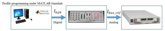 The programmable DC power supply was used to emulate renewable energy sources by generating a variable power profile. It operates in two modes: either in voltage source or current source mode. In the case of the voltage source, the voltage is equal to the reference value, and the output current must be less than the reference current. In the current source mode, the generated current is equal to the reference value, and the voltage becomes lower than the reference voltage depending on the equivalent applied DC load. In this case study, the variable profile of the current generated at the end of the simulation result is processed and converted into digital format by the Matlab/Simulink interface then sent via the dSPACE DS1104 card as an analog reference to the programmable DC power supply. The emulation process is shown in Figure 9.