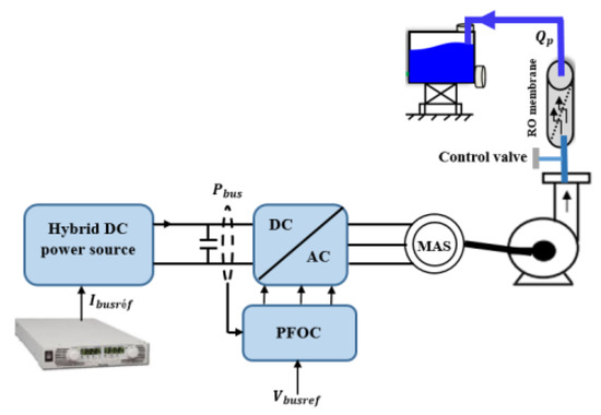 As mentioned previously, the water pumping/desalination system has three motor pumps which require three power-controlled inverters. This paper uses two variable frequencies drives for the two motor pumps (P1 and P3) operating at fixed speed (equivalent to fixed power). On the other hand, a SEMIKRON inverter coupled with a power field oriented control (PFOC) strategy is used to drive the motor pump intended for water desalination. Consequently, the motor pump operates at variable power depending on the operating mode and the evolution of the produced power from renewable sources. The originality of PFOC resides in controlling the DC bus voltage and the magnetization state of the induction motor pump. Figure 10 illustrates the proposed block diagram of the control strategy (PFOC) [28]. This control strategy must be first implemented and tested on the dSPACE card.