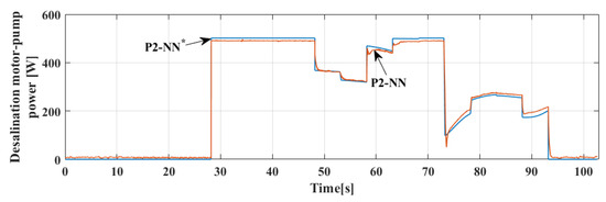 For the EMS outputs designated by the three motor pumps’ power, it is clear that the results of the pumping motor pump P1 are equal. For the desalination motor pump, there are small differences at some points (instants) of the given profile; for example, for t = 520 h, the value of the power using the fuzzy manager optimized by the genetic algorithm is equal to 2600 W against that using the neural network which is equal to 2800 W. Referring to the motor pump’s power limits, it is possible to pump, desalinate, or store water. In this case, given that both brackish water and freshwater tanks’ levels are high, the energy management has chosen the desalination mode (> ), but with two different powers. Similarly, for t = 561 h, while the neural management power for the desalination motor pump is close to 2850 W, it must be lower (close to 2600 W) than the FL-GA energy management system. Its value (> ) for the two water tank levels (brackish and fresh) is high, which favors the operation of the desalination motor pump. Also, for the other points, even with slight variations, the operating mode of the system remains unchanged. In conclusion, both Figure 6 and Figure 7 show that the ANNEMS follows the same references given by the optimized fuzzy EMS.