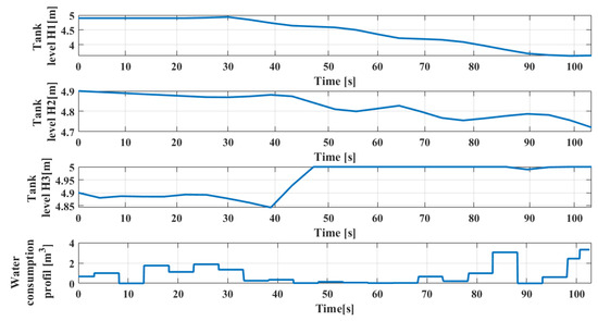 For this profile, five operating modes are presented: system shutdown, desalination, pumping, storage and desalination, pumping and desalination and storage. At the beginning of this practical scenario, the electrical power emitted by the hybrid source is zero until 13 s. During this interval, the EMS activates Mode 0 (system shutdown). Thus, there is stability in the water tanks’ levels H1 and H2 and a reduction in the tank level H3 due to the water consumption. Between 13 s and 28 s, the power generated is greater than the storage motor pump limit and the minimum power of the desalination motor pump . Also, the storage and permeate water tanks are full. Thus, the EMS remains in Mode 0. Between 28 s and 49 s, the electrical power delivered by the source is at a maximum. The EMS decides to operate all the motor pumps (Mode 7) by imposing fixed reference values, P1-NN* and P3-NN*, for the pumping and storage motor pumps. The desalination motor pump operates at its maximum power value. Then, the water tank level H1 decreases since the desalination motor pump is operating at its maximum power, which is greater than that of the pumping motor pump. In addition, the water tank level H3 is decreased due to the increase in the consumption flow rate. At t = 40 s, due to the decline in the water consumption, the water tank level H3 is increased. Between 49 s and 63 s, the hybrid electric power declines and Mode 2 is activated where the EMS must operate only the desalination. This leads to a decrease in the brackish water tank level H1, an increase in the permeate water tank level H2, and stability in the freshwater tank level H3 owing to the low water demand. Then, between 63 s and 73 s, the EMS switches to operate the three motor pumps. Hence, there is a decrease in the two tank levels H1 and H2, while the freshwater tank level H3 reaches its maximum value. Between 78 s and 93 s, the power delivered decreases and the desalination motor pump and the storage pump operate (Mode 4). During the interval between 93 s and 101 s, the power is low and the system is shutdown (Mode 0). The water tank levels H1 and H2 are constant, and the freshwater tank decreases which is justified by the height demand for consumption.